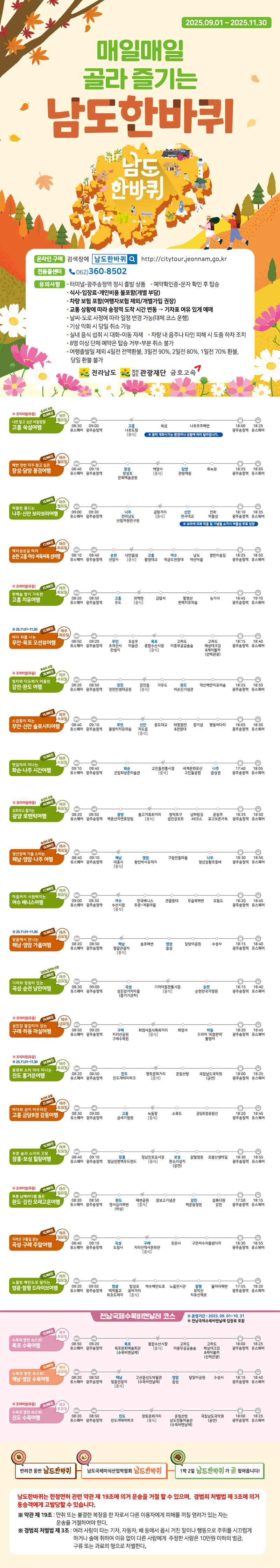 남도한바퀴는 매년 다양한 테마 코스를 운영합니다. 2025년에는 봄꽃·바다·문화유산·미식 코스 등으로 구성되어 있어, 취향에 따라 선택할 수 있습니다. 예를 들어 ‘보성 녹차밭 & 순천만 습지’ 코스는 자연과 힐링을 동시에 즐길 수 있어 인기가 높습니다. 또한 ‘담양 죽녹원 & 메타세쿼이아길’ 코스는 사계절 내내 아름다운 풍경으로 사진 명소로 손꼽힙니다. 여름철에는 ‘여수 해양레일바이크 & 오동도 코스’, 가을에는 ‘곡성 기차마을 단풍길 투어’가 추천됩니다. 각 코스는 여행 시간대에 맞춰 구성되어 있으며, 식사와 휴식시간도 포함되어 있어 초보 여행자도 무리 없이 즐길 수 있습니다. 특히 일부 코스에는 지역 특산품 체험이나 농촌마을 방문이 포함되어 있어, 단순 관광을 넘어 ‘체험형 여행’으로 만족도를 높입니다. 광주를 중심으로 1시간 내 이동 가능한 지역이 많기 때문에, 당일치기에도 전남의 다양한 매력을 충분히 경험할 수 있습니다. 2025년 전남 여행은 ‘남도한바퀴’로 더 편하고 풍성하게 즐길 수 있습니다.